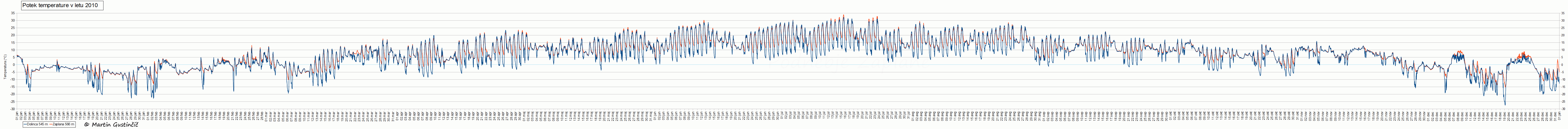 Potek temperature v mraziÅ¡Äu Dolinca in na meteoroloÅ¡ki postaji Zaplana v letu 2010.