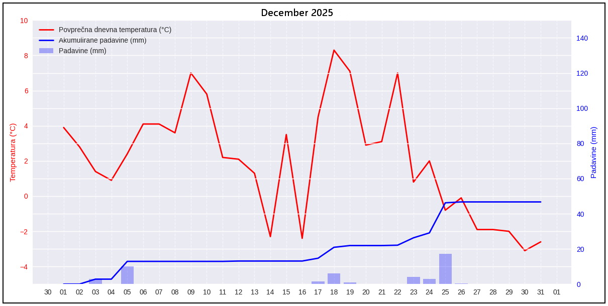 Povprecna dnevna temperatura in padavine na Zaplani v letu 2025.