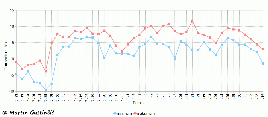 Zanimivo se je v decembru najprej zvrstilo Å¡est zaporednih ledenih dni, v katerih se temperatura Äez dan ni dvignila nad 0 °C, nato se temperatura v dobrem mesecu dni tudi ponoÄi ni spustila pod lediÅ¡Äe, 24. januarja pa se je toplo obdobje vendarle konÄalo z obilnim sneženjem. Na Zaplani je bilo obdobje brez negativne temperature zraka daljÅ¡e kot na nekaterih nižinskih vremenskih postajah. Zaplano je namreÄ otoplitev z jugozahodnim vetrom dosegla 19. decembra, medtem ko je nekatere nižinske kraje hladen zrak z meglo pokrival Å¡e nekaj naslednjih dni.