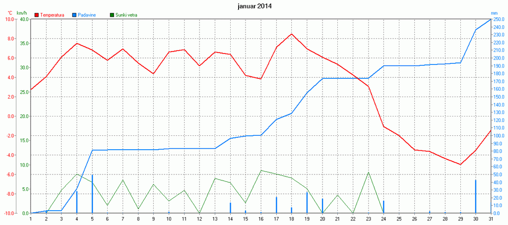 PovpreÄna dnevna temperatura, veter in kumulativa padavin na Zaplani v januarju 2014.  Podatki o vetru za obdobje po 24. januarju zaradi snega ne odražajo dejanskega stanja.