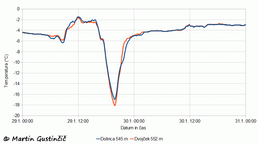 V sosednjem mraziÅ¡Äu DvojÄek je prviÄ po vzpostavitvi meritev priÅ¡la do izraza veÄja odprtost kotanje in s tem veÄja izpostavljenost mrazu kot v sosednjih bolj znanih mraziÅ¡Äih. Tekom merilnega obdobja je bilo mraziÅ¡Äe DvojÄek ob temperaturni inverziji sicer vedno toplejÅ¡e, hladnejÅ¡e od Dolince pa je bilo ravno na dan najveÄjega mraza 29. januarja, ko je bilo izmerjeno -18,1 °C. Ob prehodni razjasnitvi in snežni odeji je bila odloÄilna veÄja hitrost padanje temperature v odprtem DvojÄku in poÄasnejÅ¡e ohlajanje v bolj zaprti Dolinci.