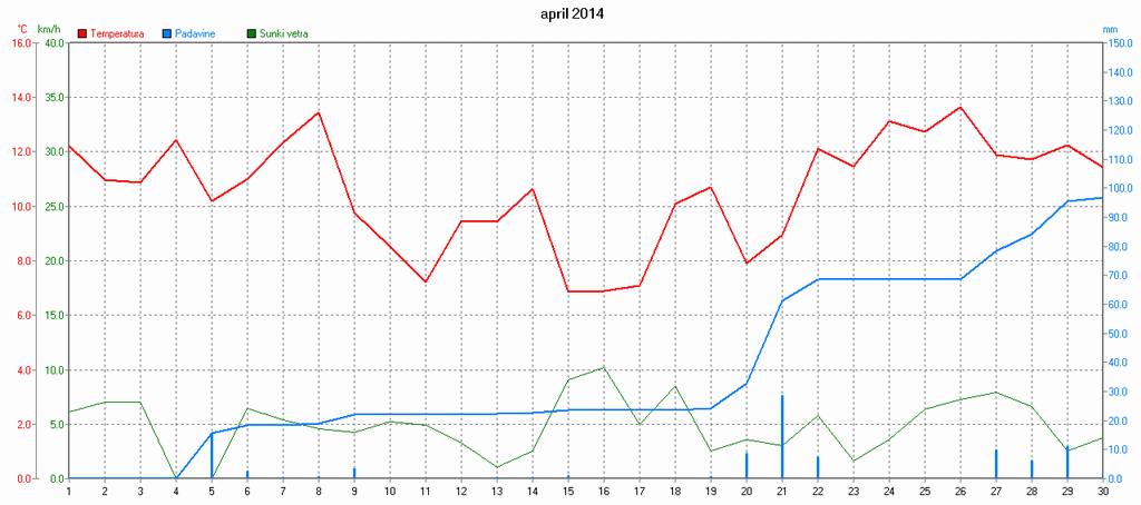PovpreÄna dnevna temperatura, veter in kumulativa padavin na Zaplani v aprilu 2014.