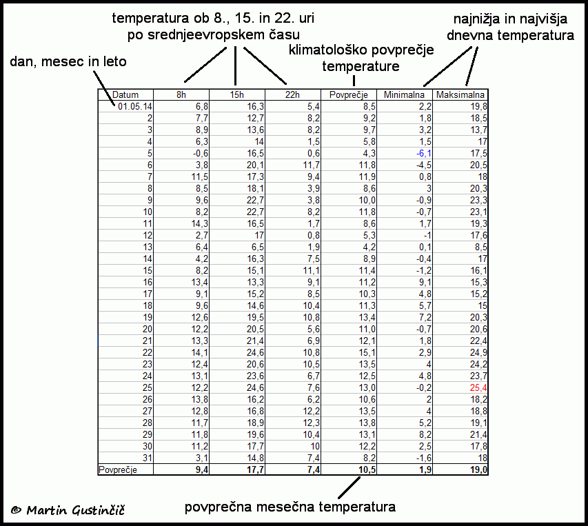 Primer temperaturnih podatkov za mesec maj iz mraziÅ¡Äa Dolinca.