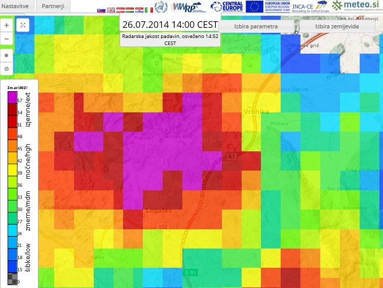 Po klasiÄnih meritvah je v Äasu celotne nevihte padlo 45,1 mm dežja, preraÄunano iz 47 sekundnega merilnega intervala elektronskega dežemera pa je znaÅ¡ala intenziteta najmoÄnejÅ¡ega naliva 230 mm/h, kar je sicer redkost, nikakor pa ne gre za rekordno vrednost. Podobno kot se je dogajalo že v prvi polovici letoÅ¡njega poletja je tudi tokrat nevihta skoraj povsem obÅ¡la mesto Logatec, kjer tik po nevihti koliÄina padavin ni presegla 2 mm. Aktivnost strel je bila velika in ob razelektritvah so se na vremenski postaji pojavile tehniÄne težave v delovanju vetromera, elektronski dežemer pa je zaradi odbijanja toÄe izmeril kar 5 mm manj padavin kot klasiÄna posoda, v kateri so zaradi veÄje globine ostala ujeta vsa ledena zrna.