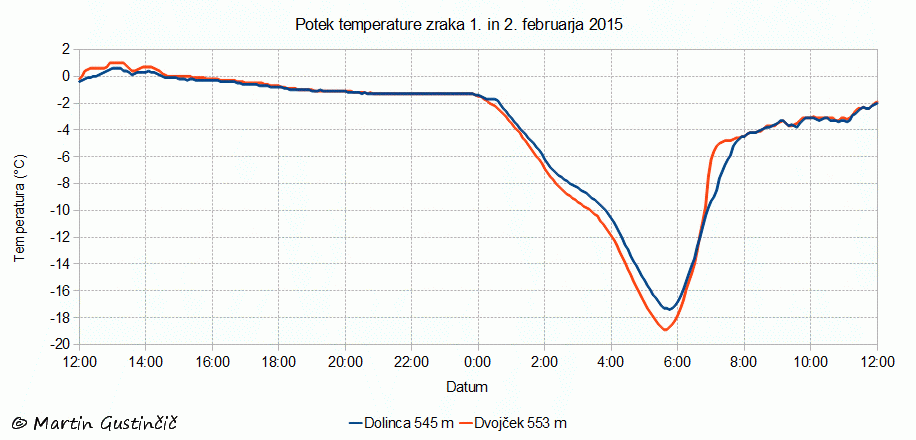 V najhladnejÅ¡i noÄi na 7. februar je bilo v DvojÄku za desetinko stopinje C topleje kot v Dolinci. ViÅ¡ji minimum od tistega v Dolinci je bil posledica vzhodnega vetra, ki je premeÅ¡al plitvo temperaturno inverzijo v DvojÄku, medtem ko se je v bolj zatiÅ¡ni Dolinci temperatura zraka Å¡e nekaj Äasa spuÅ¡Äala. Pred omenjenim vetrom je bilo sicer v DvojÄku za 1 °C hladneje. To je bila edina noÄ, v kateri je bila Dolinca hladnejÅ¡a, v preostalih noÄeh s snežno odejo je bil hladnejÅ¡i DvojÄek. V noÄi na 2. februar je bilo v DvojÄku celo za 1,7 °C hladneje kot v Dolinci. HitrejÅ¡e in izrazitejÅ¡e ohlajanje ozraÄja v DvojÄku glede na obliko mraziÅ¡Äa ni preseneÄenje, saj ponoÄi iz plitve in bolj odprte kraÅ¡ke kotanje toplota bolj neovirano izhaja nazaj v vesolje kot iz bolj zaprte Dolince.