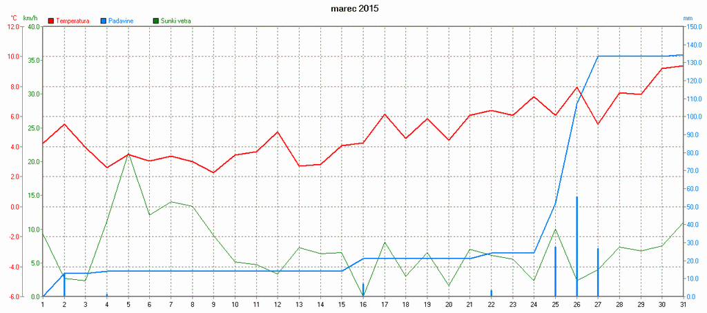 PovpreÄna dnevna temperatura, veter in kumulativa padavin na Zaplani v marcu 2015.