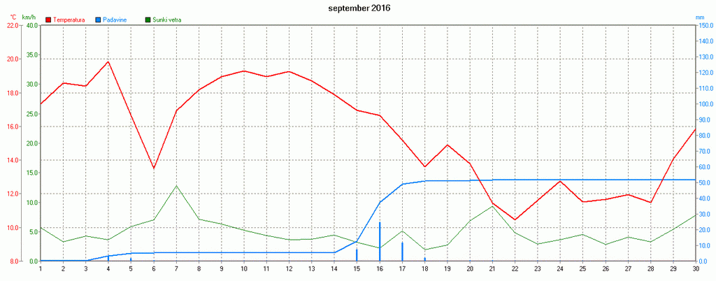 PovpreÄna dnevna temperatura, veter in kumulativa padavin na Zaplani v septembru 2016.