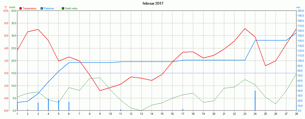 PovpreÄna dnevna temperatura, veter in kumulativa padavin na Zaplani v februarju 2017.