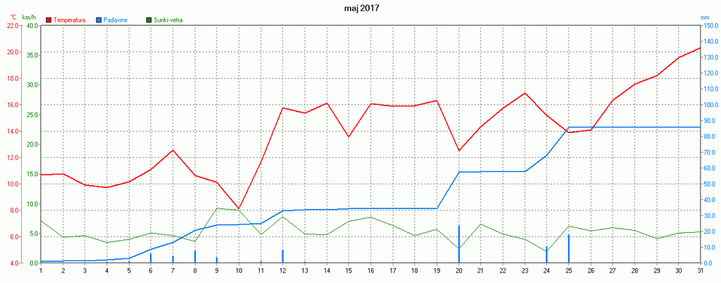 PovpreÄna dnevna temperatura, veter in kumulativa padavin na Zaplani v maju 2017.