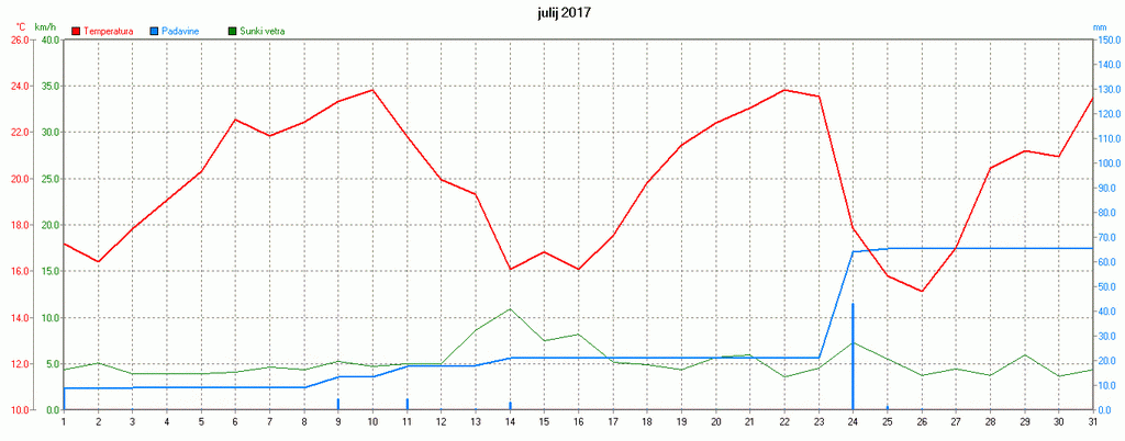 PovpreÄna dnevna temperatura, veter in kumulativa padavin na Zaplani v juliju 2017.