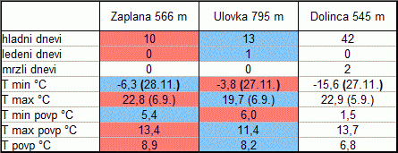 NajviÅ¡je izmerjene vrednosti temperature zraka so bile izrazito skromne, kar je odraz namoÄenega septembra, v katerem je potencial za visoke temperature obiÄajno Å¡e vedno znaten. Navsezadnje je bilo v preteklosti v septembru izmerjeno tudi že 30 °C, letos pa temperatura na Zaplani ni presegla 23 °C, na Ulovki pa niti 20 °C. Ulovka je bila v povpreÄju hladnejÅ¡a od Spodnje Zaplane, izjema je bilo le oktobrsko babje poletje s pogosto temperaturno inverzijo, ob kateri je bila Ulovka tudi na meseÄni ravni toplejÅ¡a od nižjih predelov Zaplane. Na Ulovki se je temperatura prviÄ spustila pod lediÅ¡Äe 13. novembra, dva tedna kasneje kot na Spodnji Zaplani. Izstopa temperatura nižja od -15 °C v mraziÅ¡Äih, ki je posledica sovpadanja snežne odeje in jasnih noÄi, kar se v zadnjih letih ne zgodi prav pogosto niti sredi zime.