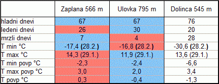 V spodnji tabeli so zbrani statistiÄni podatki za vremensko postajo Zaplana (reprezentativna za obmoÄje Spodnje Zaplane), Ulovko (najviÅ¡ja toÄka Zaplane) in mraziÅ¡Äe Dolinca. Tabela prikazuje Å¡tevilo hladnih dni (najnižja dnevna temperatura je nižja ali enaka 0 °C), ledenih dni (najviÅ¡ja dnevna temperatura je nižja ali enaka 0 °C), mrzlih dni (najnižja dnevna temperatura je nižja ali enaka -10 °C), absolutno najnižjo oziroma najviÅ¡jo zimsko temperaturo (T min in T max), zimsko povpreÄje minimalne oziroma maksimalne dnevne temperature (Tmin povp in Tmax povp) ter povpreÄno zimsko temperaturo (T povp – dnevno povpreÄje je izraÄunano iz vrednosti temperature ob 7., 14. in dvakratne vrednosti temperature ob 21. uri).
