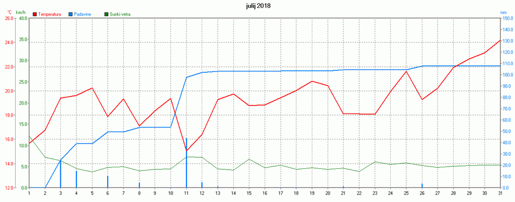 PovpreÄna dnevna temperatura, veter in kumulativa padavin na Zaplani v juliju 2018.