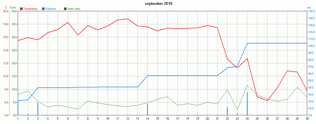 PovpreÄna dnevna temperatura, veter in kumulativa padavin na Zaplani v septembru 2018.