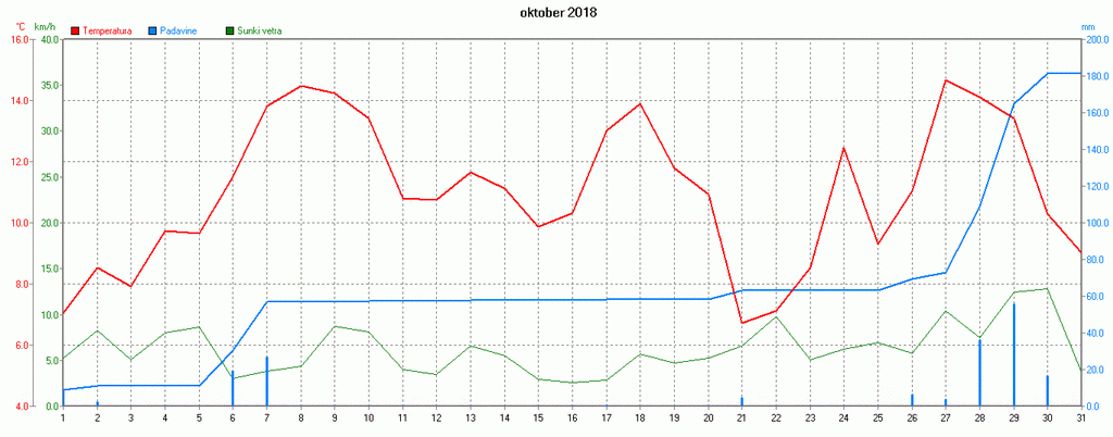 PovpreÄna dnevna temperatura, veter in kumulativa padavin na Zaplani v oktobru 2018.