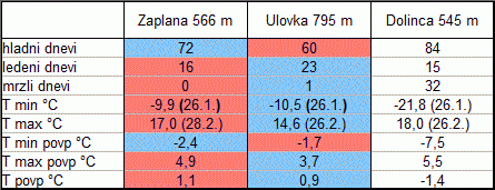 V spodnji tabeli so zbrani statistiÄni podatki za vremensko postajo Zaplana (reprezentativna za obmoÄje Spodnje Zaplane), Ulovko (najviÅ¡ja toÄka Zaplane) in mraziÅ¡Äe Dolinca. Tabela prikazuje Å¡tevilo hladnih dni (najnižja dnevna temperatura je nižja ali enaka 0 °C), ledenih dni (najviÅ¡ja dnevna temperatura je nižja ali enaka 0 °C), mrzlih dni (najnižja dnevna temperatura je nižja ali enaka -10 °C), absolutno najnižjo oziroma najviÅ¡jo zimsko temperaturo (T min in T max), zimsko povpreÄje minimalne oziroma maksimalne dnevne temperature (Tmin povp in Tmax povp) ter povpreÄno zimsko temperaturo (T povp – dnevno povpreÄje je izraÄunano iz vrednosti temperature ob 7., 14. in dvakratne vrednosti temperature ob 21. uri).