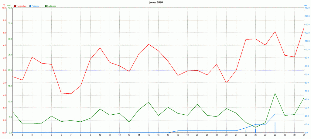 PovpreÄna dnevna temperatura, veter in kumulativa padavin na Zaplani januarja 2020.