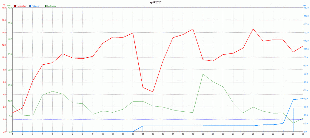 PovpreÄna dnevna temperatura, veter in kumulativa padavin na Zaplani aprila 2020.