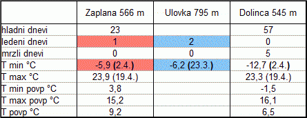 Spodnja tabela prikazuje Å¡tevilo hladnih dni (najnižja dnevna temperatura je nižja ali enaka 0 °C), ledenih dni (najviÅ¡ja dnevna temperatura je nižja ali enaka 0 °C), mrzlih dni (najnižja dnevna temperatura je nižja ali enaka -10 °C), absolutno najnižjo oziroma najviÅ¡jo temperaturo (T min in T max), pomladno povpreÄje minimalne oziroma maksimalne dnevne temperature (Tmin povp in Tmax povp) ter povpreÄno temperaturo v meteoroloÅ¡ki pomladi 2020 (T povp – dnevno povpreÄje je izraÄunano iz vrednosti temperature ob 8., 15. in dvakratne vrednosti temperature ob 22. uri). Na merilnem mestu Ulovka je priÅ¡lo do nepriÄakovane izpraznitve baterije v termometru, s tem pa do mesec dni dolgega izpada podatkov. Merilno mesto Dolinca se nahaja v mraziÅ¡Äu.