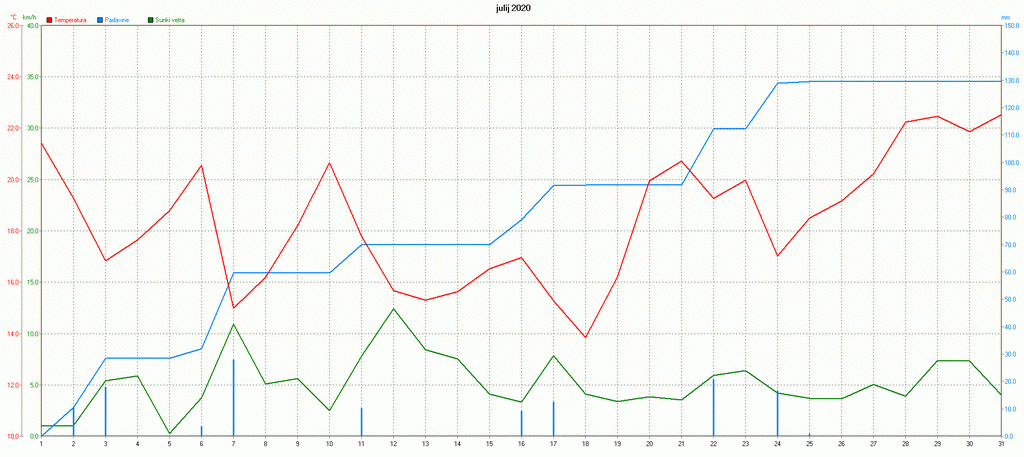 PovpreÄna dnevna temperatura, veter in kumulativa padavin na Zaplani julija 2020.