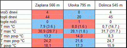 LetoÅ¡nji vroÄinski val ni prinesel izjemne vroÄine, na Spodnji Zaplani se ni ogrelo nad 31 °C, v najviÅ¡jih delih Zaplane pa je temperatura obstala na 28 °C. Na Ulovki je bila zabeležena ena topla noÄ s temperaturo nad 20 °C, vendar je bilo teh v preteklosti že mnogo veÄ, denimo v poletju 2013 kar 13. Å tevilo vroÄih dni nad 30 °C je bilo drugo najmanjÅ¡e v zadnjem desetletju, za deževnim poletjem 2014. ÄŒe se je v obdobju med letoma 2004 in 2016 le enkrat zgodilo, ko v mraziÅ¡Äih Zaplane tekom poletja vsaj v eni noÄi ni zmrzovalo, pa je letos minilo že Äetrto zaporedno poletje brez izmerjene negativne temperature zraka. Vzrok za to je enak kot v zadnjih treh poletjih in sicer v odsotnosti suhih ohladitev brez padavin ob prevladujoÄemu vzhodnemu vetru. Tudi letos so hladnejÅ¡a jutra sledila padavinam, vlažnost ozraÄja in tal je bila v najhladnejÅ¡ih noÄeh velika in s tem v mraziÅ¡Äu ni bilo ustreznih pogojev za izrazitejÅ¡e ohladitve.