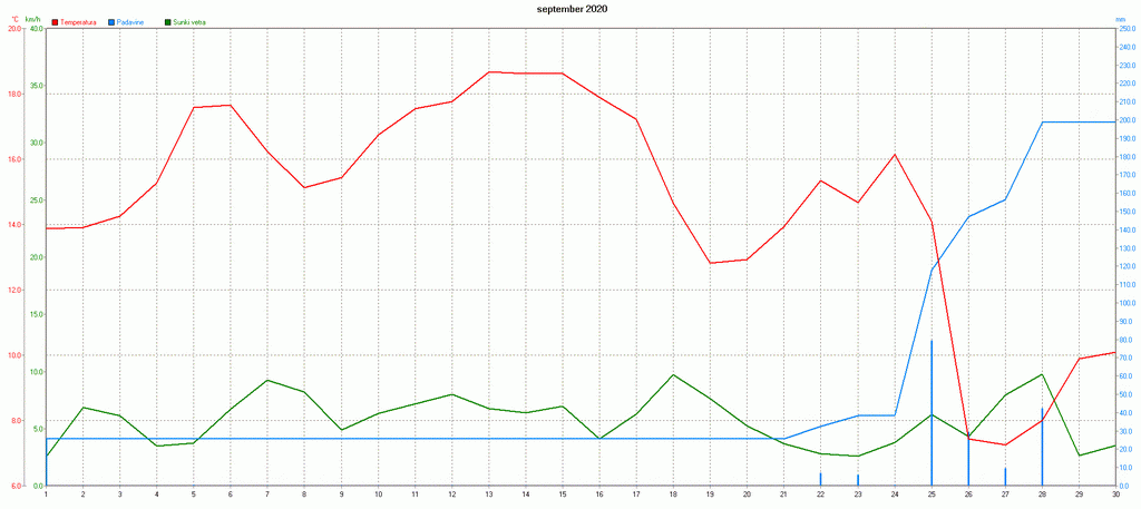 PovpreÄna dnevna temperatura, veter in kumulativa padavin na Zaplani septembra 2020.