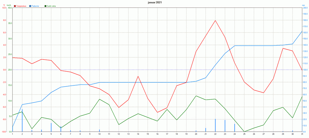 PovpreÄna dnevna temperatura, veter in kumulativa padavin na Zaplani januarja 2021.