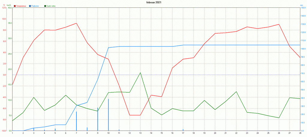 PovpreÄna dnevna temperatura, veter in kumulativa padavin na Zaplani februarja 2021.