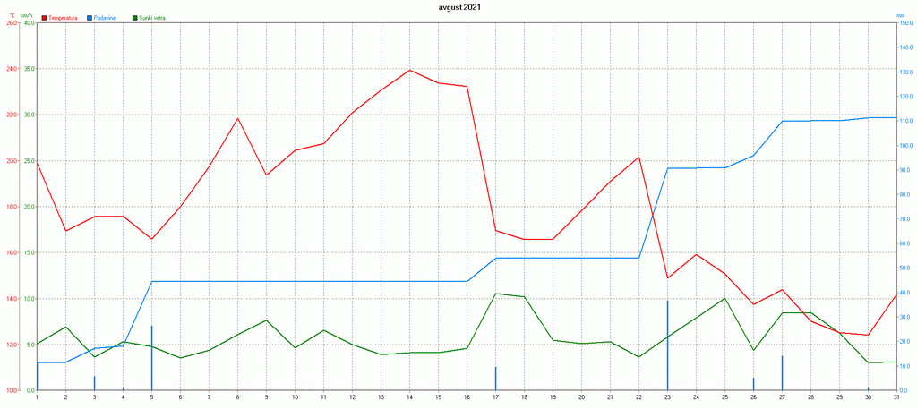 Povprecna dnevna temperatura, veter in kumulativa padavin na Zaplani avgusta 2021.