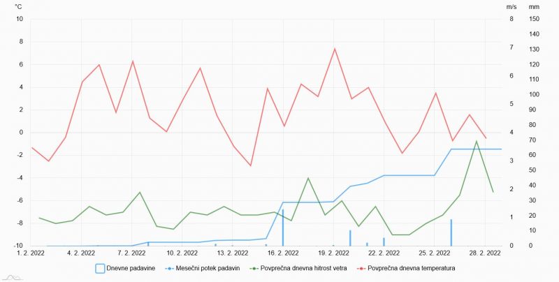Povprecna dnevna temperatura, veter in kumulativa padavin na Zaplani februarja 2022.