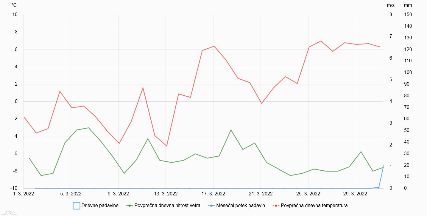 Povprecna dnevna temperatura, veter in kumulativa padavin na Zaplani marca 2022.