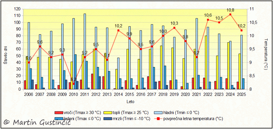 Število izbranih meteoroloških dni v letu 2025 v primerjavi s preteklimi leti.