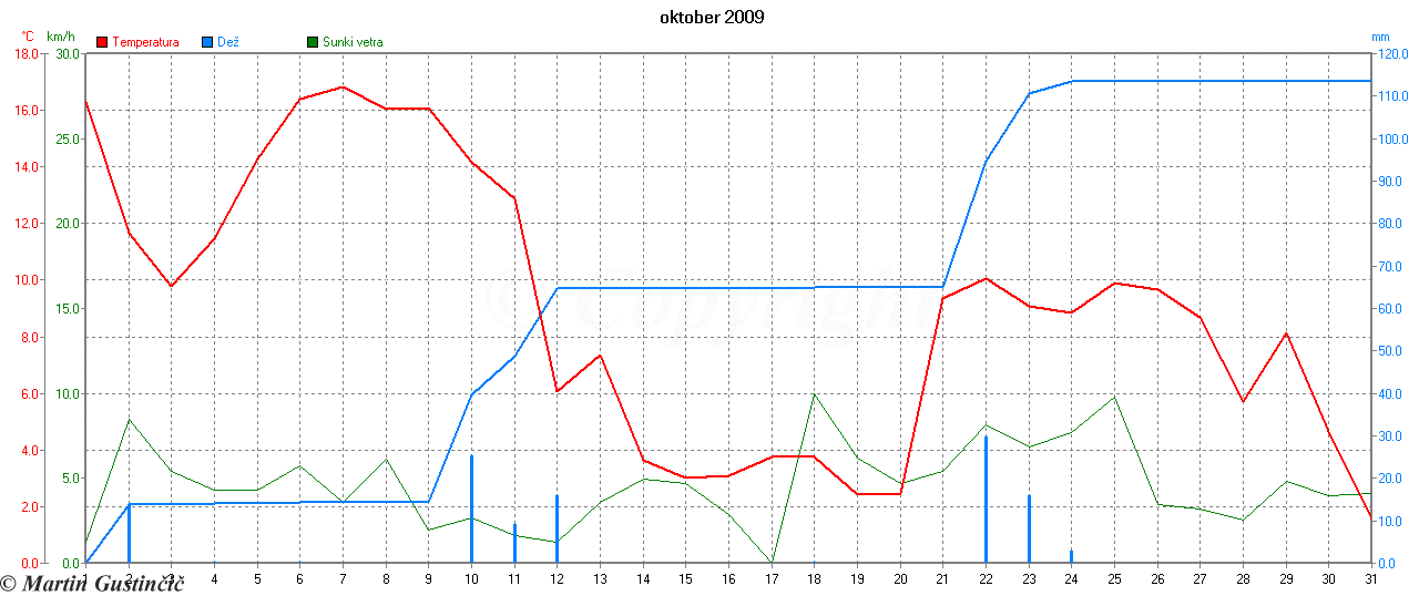 PovpreÄna dnevna temperatura, veter in kumulativa padavin na Zaplani oktobra 2009.