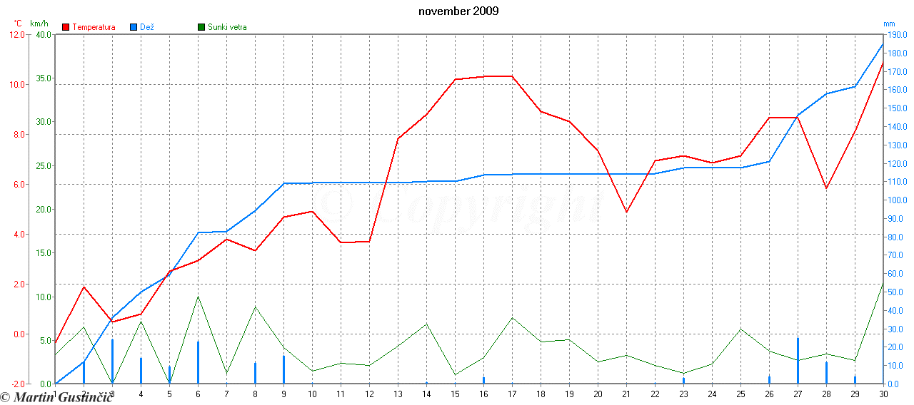 PovpreÄna dnevna temperatura, veter in kumulativa padavin na Zaplani novembra 2009.