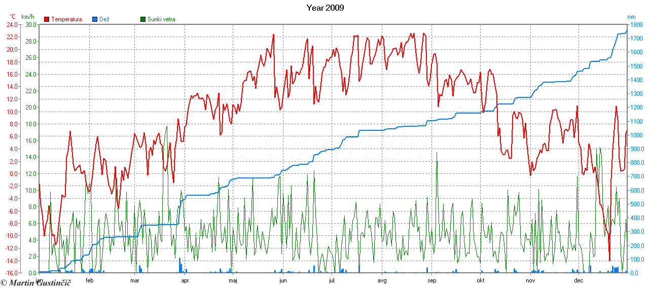 PovpreÄna dnevna temperatura, veter in kumulativa padavin na Zaplani v letu 2009.