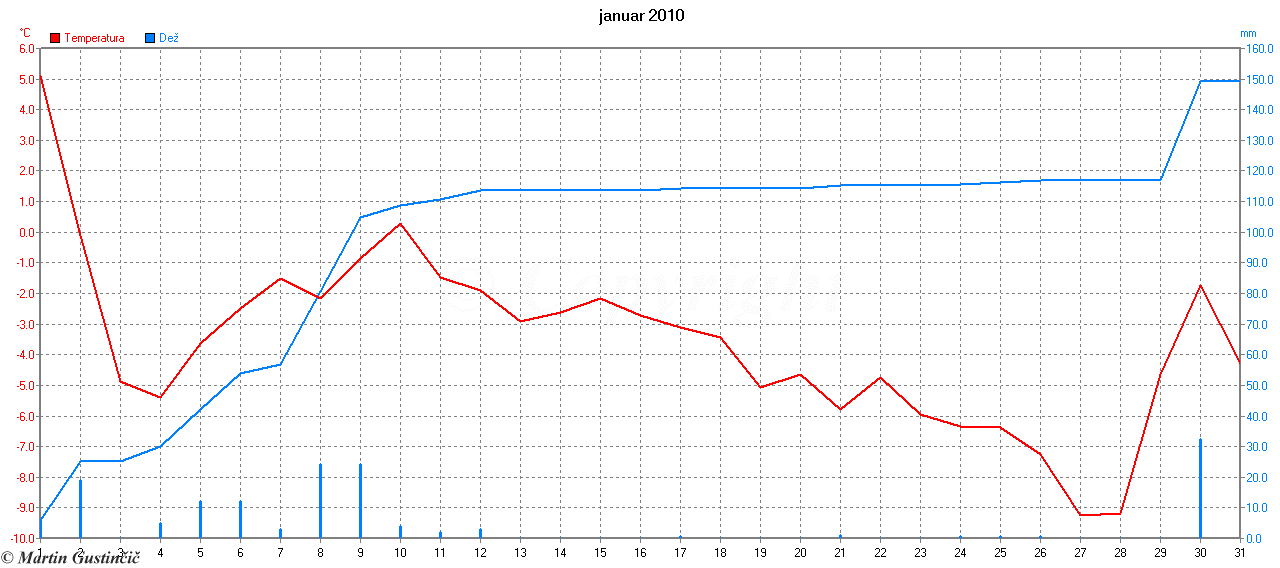 PovpreÄna dnevna temperatura in kumulativa padavin na Zaplani januarja 2010.