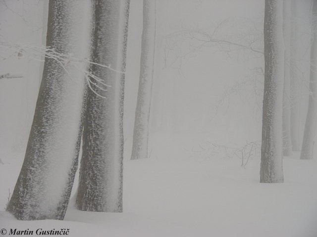 Na Zaplani se po zasneženih deblih dreves opazi, da med sneženjem pogosto piha moÄnejÅ¡i vzhodni veter.