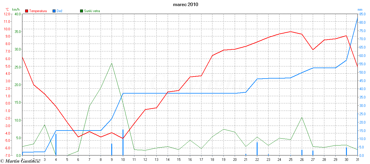 PovpreÄna dnevna temperatura, veter in kumulativa padavin na Zaplani marca 2010.