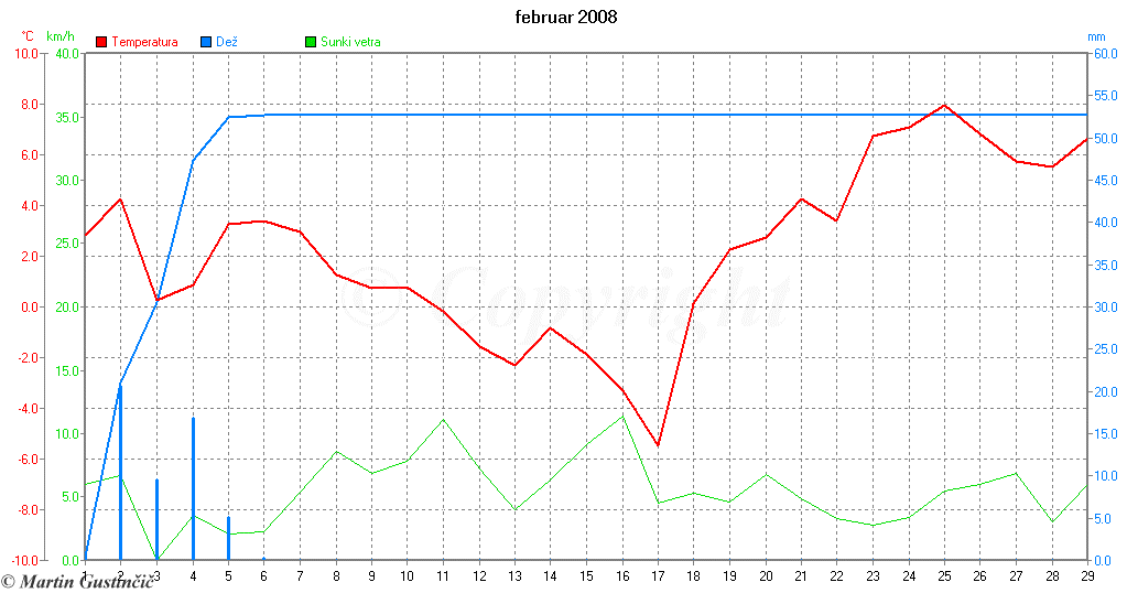 PovpreÄna dnevna temperatura, veter in kumulativa padavin na Zaplani februarja 2008.