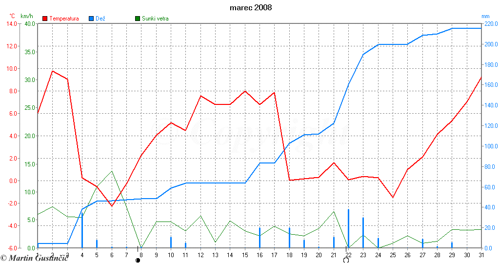 PovpreÄna dnevna temperatura, veter in kumulativa padavin na Zaplani marca 2008.