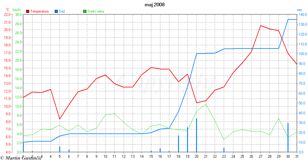PovpreÄna dnevna temperatura, veter in kumulativa padavin na Zaplani maja 2008.