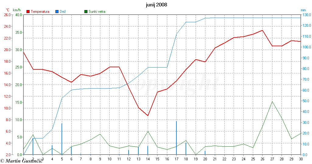 PovpreÄna dnevna temperatura, veter in kumulativa padavin na Zaplani junija 2008.