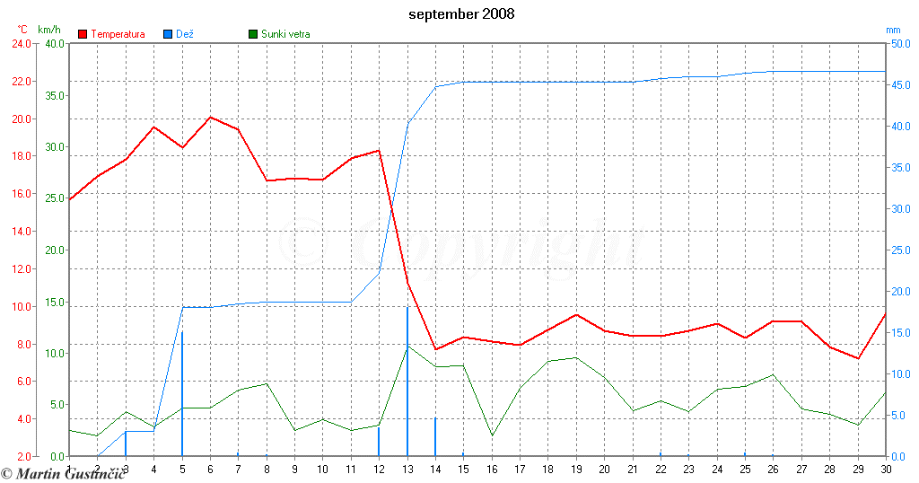 PovpreÄna dnevna temperatura, veter in kumulativa padavin na Zaplani septembra 2008.