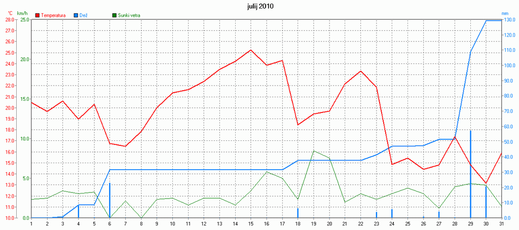 PovpreÄna dnevna temperatura, veter in kumulativa padavin na Zaplani julija 2010.