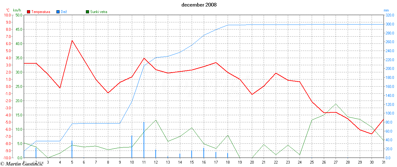 PovpreÄna dnevna temperatura, veter in kumulativa padavin na Zaplani decembra 2008.