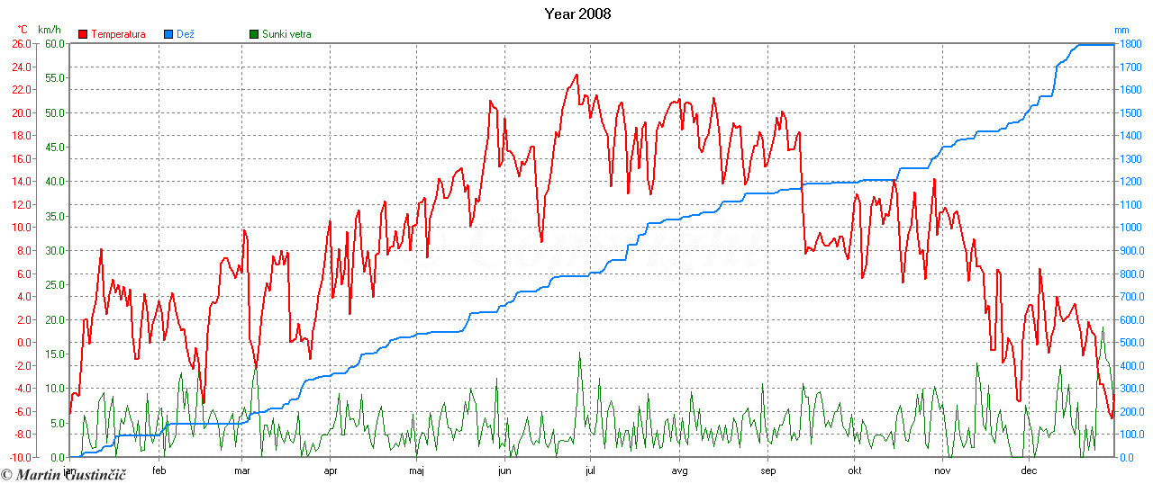PovpreÄna dnevna temperatura, veter in kumulativa padavin na Zaplani v letu 2008.