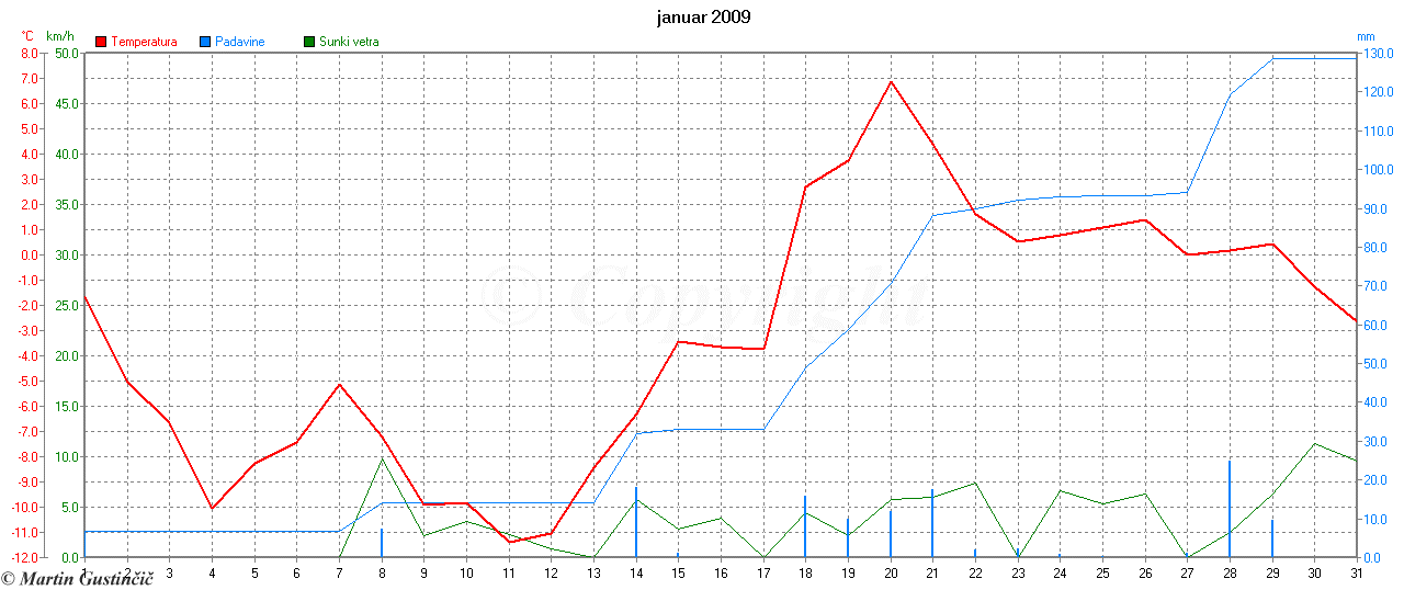 PovpreÄna dnevna temperatura, veter in kumulativa padavin na Zaplani januarja 2009.