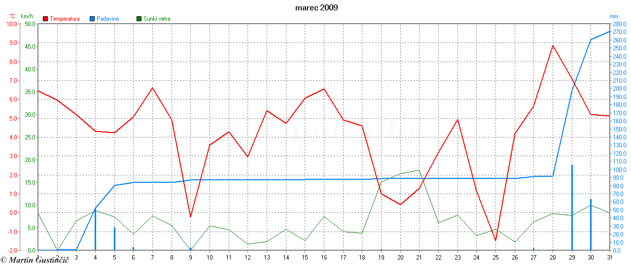 PovpreÄna dnevna temperatura, veter in kumulativa padavin na Zaplani marca 2009.