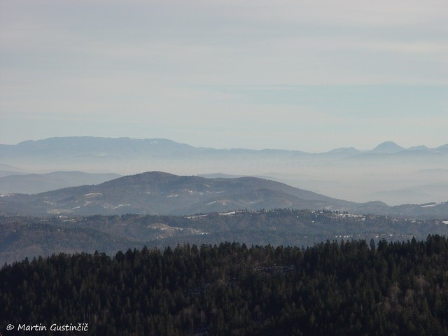 Pogled na Zaplano in mrÄ v Ljubljanski kotlini z Javornika (1240 m) nad ÄŒrnim Vrhom nad Idrijo. Fotografirano 6. februarja v Äasu najviÅ¡jih temperatur.