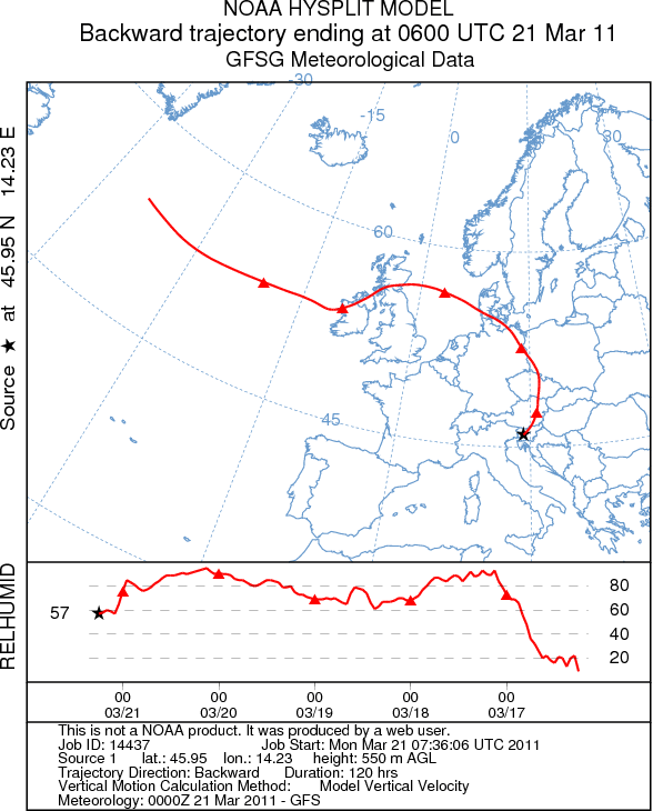 Potovanje zraÄne mase do Zaplane v obdobju med 16. in 21. marcem. ZraÄna masa se je proti koncu svoje poti, na prehodu Äez Avstrijo in za viÅ¡jimi gorskimi pregradami tudi nekoliko osuÅ¡ila. Kot ciljna toÄka je izbrana Zaplana z nadmorsko viÅ¡ino 550 m, toÄke na liniji pa so nanizane na vsakih 24 ur.